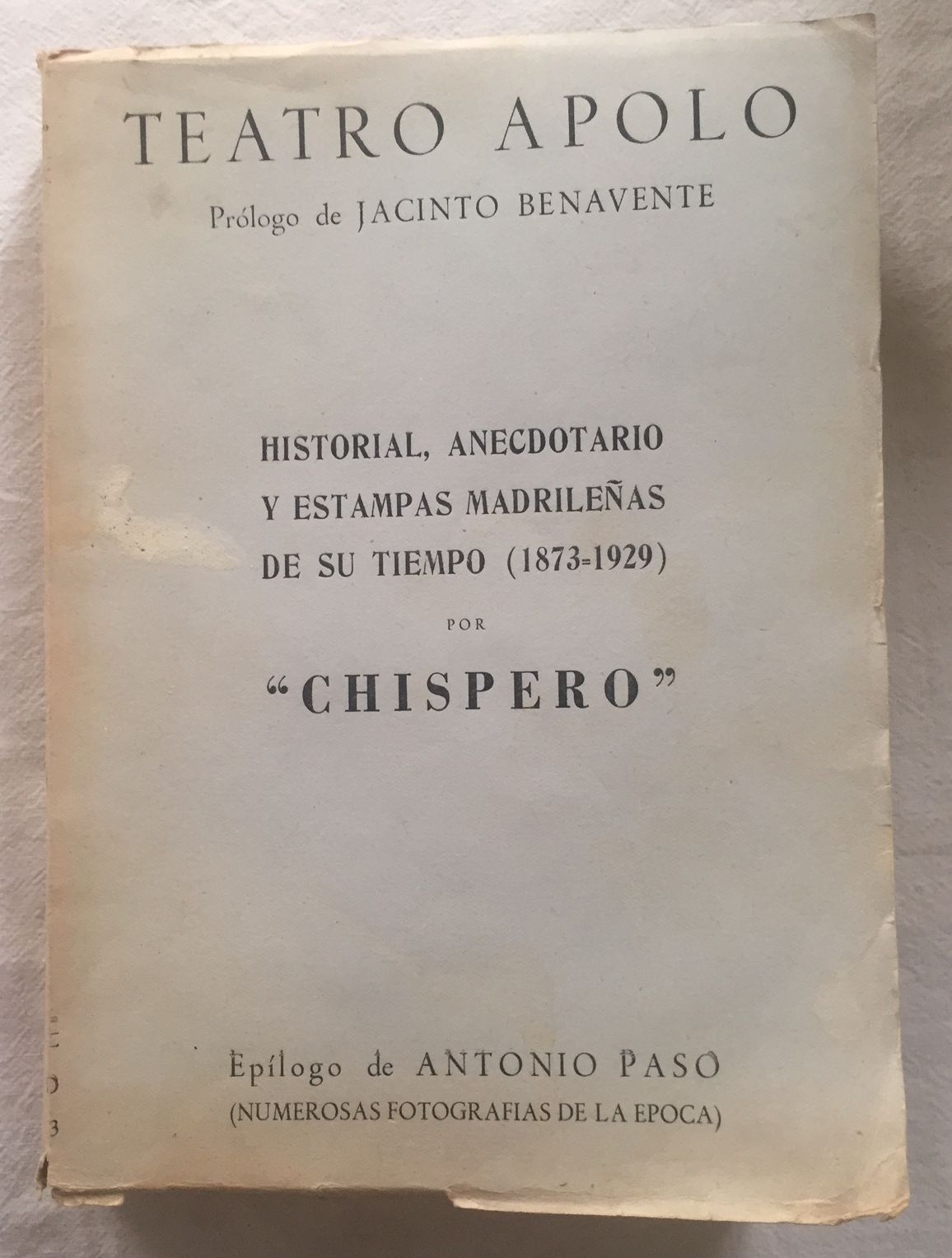 TEATRO APOLO. Historial, anecdotario y estampas madrileñas de su tiempo (1873-1929). Prólogo de Jacinto Benavente. Epílogo de Antonio Paso