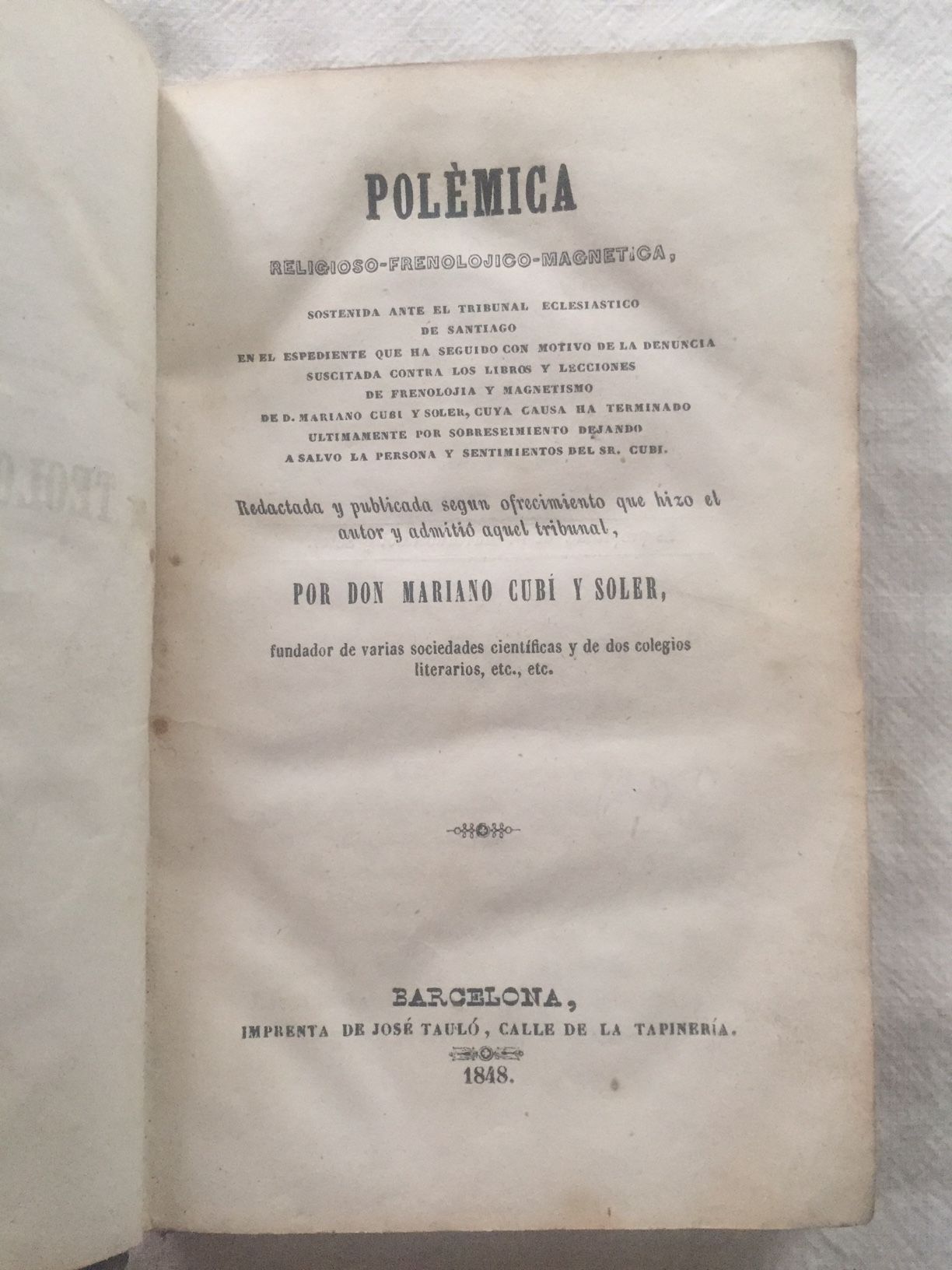 POLÉMICA RELIGIOSO-FRENOLOJICO-MAGNETICA, sostenida ante el Tribunal Eclesiástico de Santiago en el espediente que ha seguido con motivo de la denuncia suscitada contra los libros y lecciones de frenolojia y magnetismo de D. Mariano Cubí y Soler...