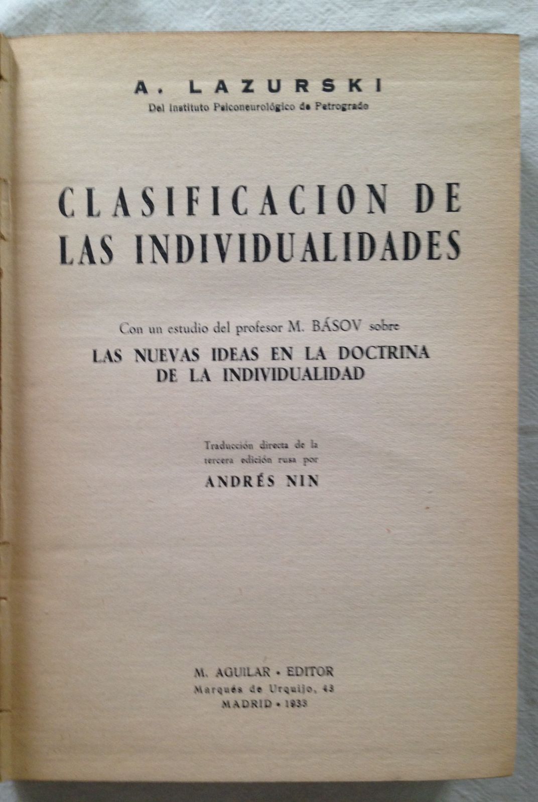 CLASIFICACIÓN DE LAS INDIVIDUALIDADES. Con un estudio del profesor M. Básov sobre Las Nuevas Ideas en la Doctrina de la Individualidad. Traducción directa de la tercera edición rusa por Andrés Nin