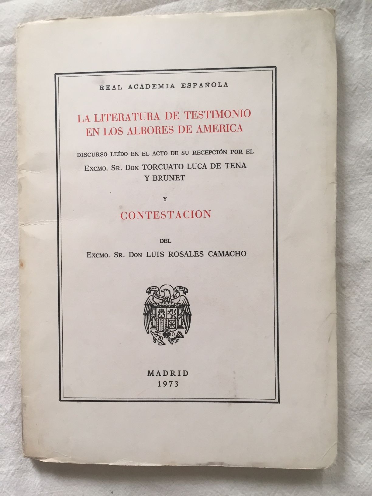 LA LITERATURA DE TESTIMONIO EN LOS ALBORES DE AMERICA. Discurso leído el día 3 de junio de 1973, en su recepción pública, por...y contestación del...