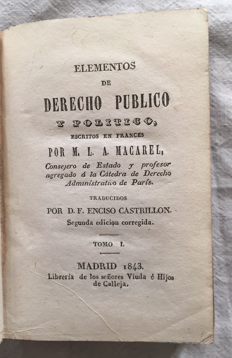 ELEMENTOS DE DERECHO PUBLICO Y POLITICO. Traducidos por D. F. Enciso Castrillon. 2 Tomos
