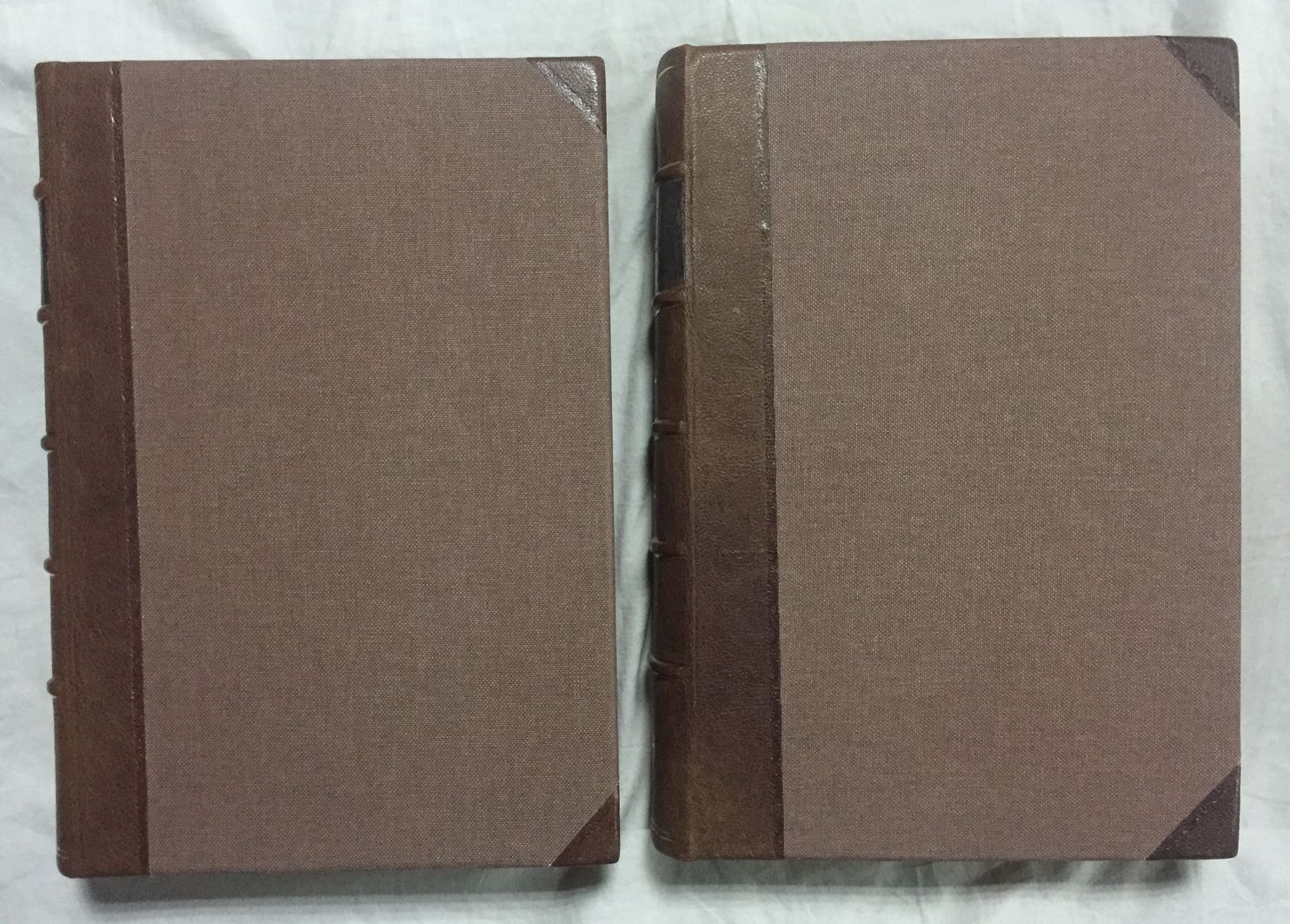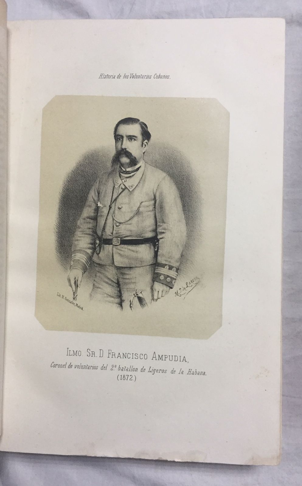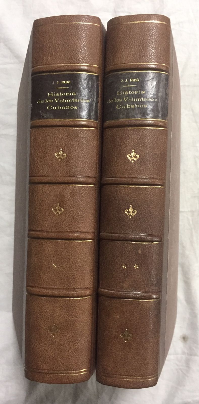 2 Vols. 32x23, XVIIIp, 645p. - 597p, 1h, numerosas láminas con grabados litográficos de los voluntarios cubanos, algunos rastros de humedad en los márgenes inferiores del tomo I (fundamentalmente primeras y últimas hojas) y en los márgenes superiores de las primeras y últimas páginas del tomo II. Holandesa puntas piel-tela, tejuelo, nervios y dorados en lomo, papeles de guarda pintados artesanalmente en acuarela. Buen estado general.