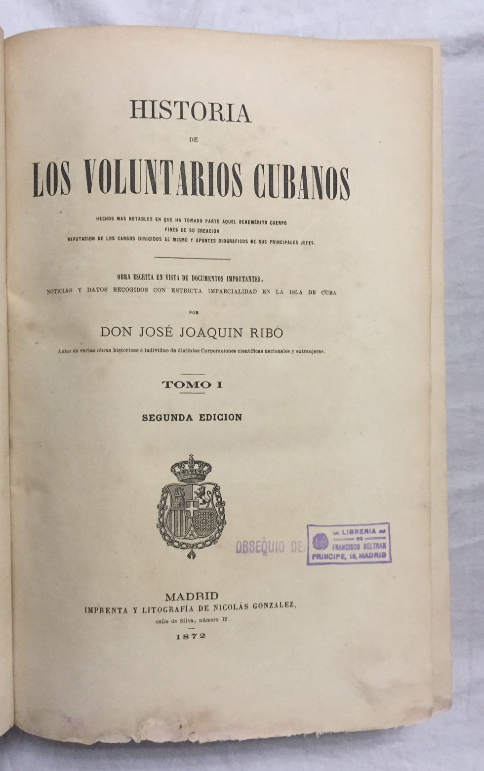HISTORIA DE LOS VOLUNTARIOS CUBANOS. Obra escrita en vista de documentos importantes, noticias y datos recogidos con estricta imparcialidad en la Isla de Cuba. 2 Tomos.