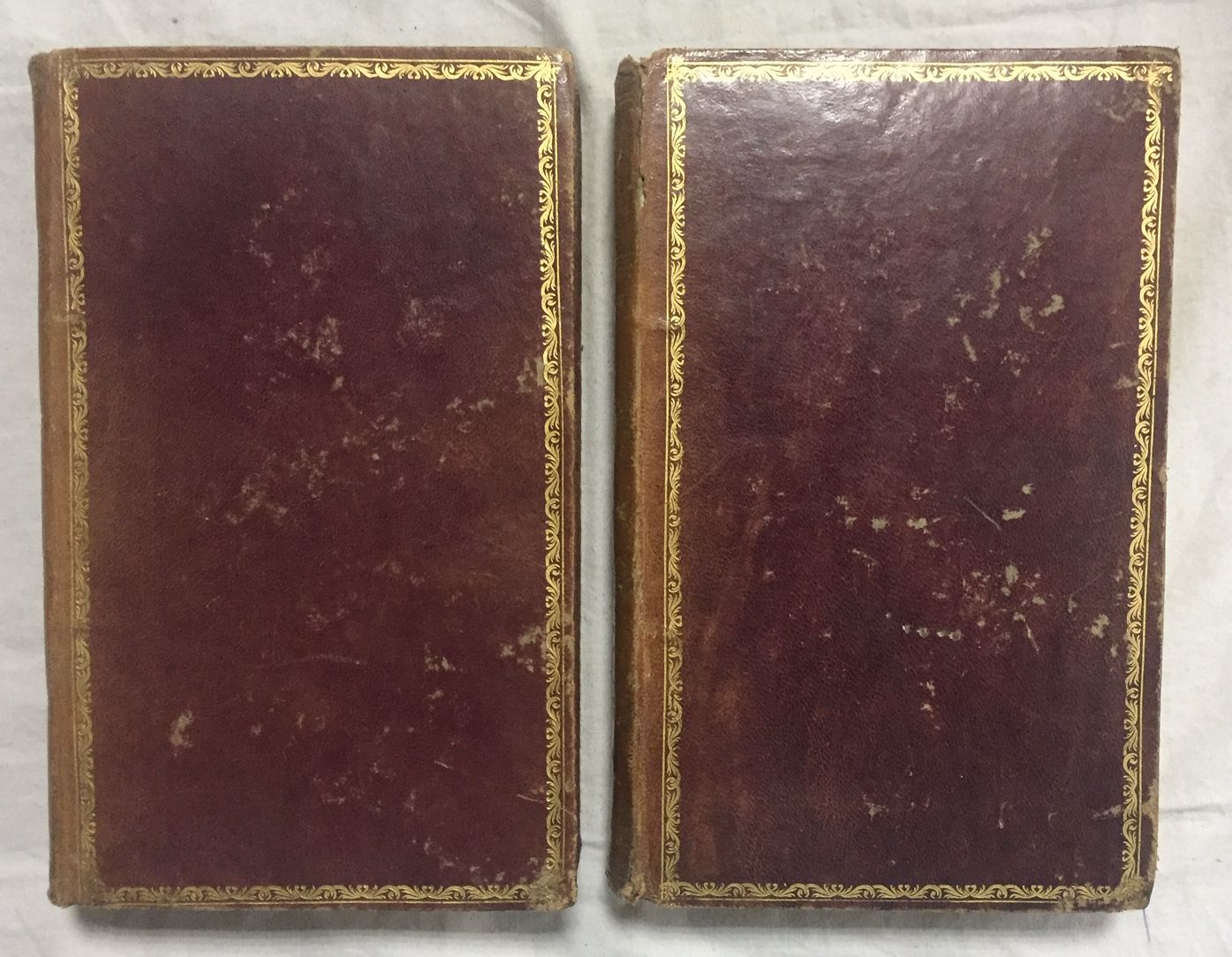 2 Vols. 21'5x13, 494p. - 476p. Plena piel, ruedas doradas en planos, dorados en lomo, cortes pintados. Obra muy rara