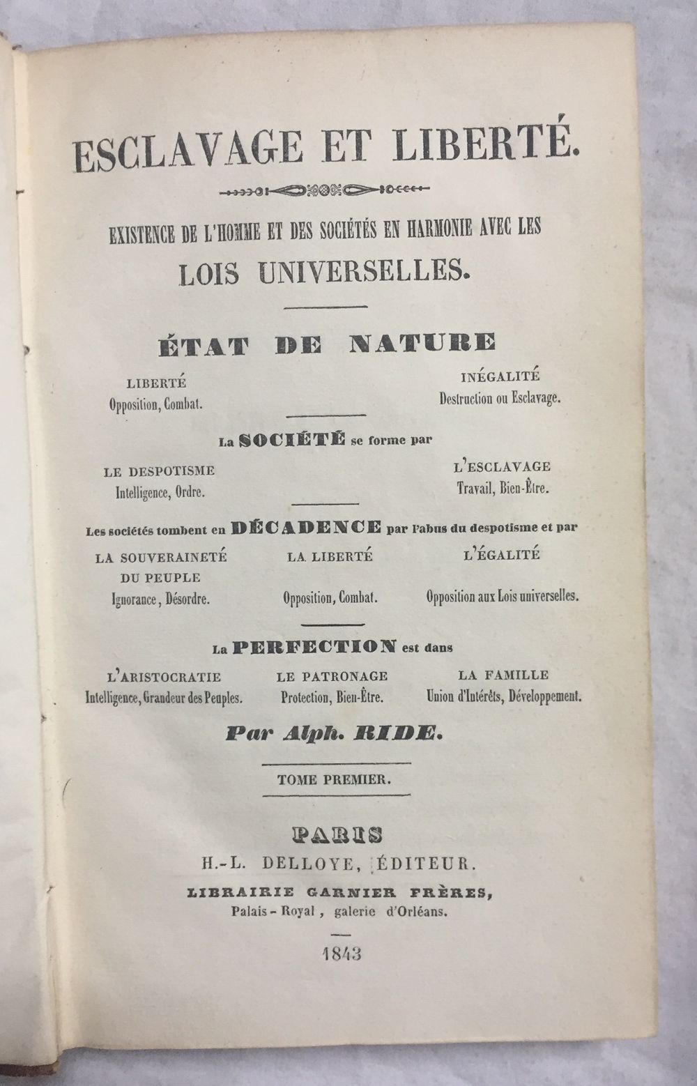 ESCLAVAGE ET LIBERTÉ. Existence de l'homme et des sociétés en harmonie avec les Lois Universelles. État de nature. Liberté. Opposition, Combat. Inégalité. Destruction ou esclavage. La société se forme par le despotisme...2 Tomes