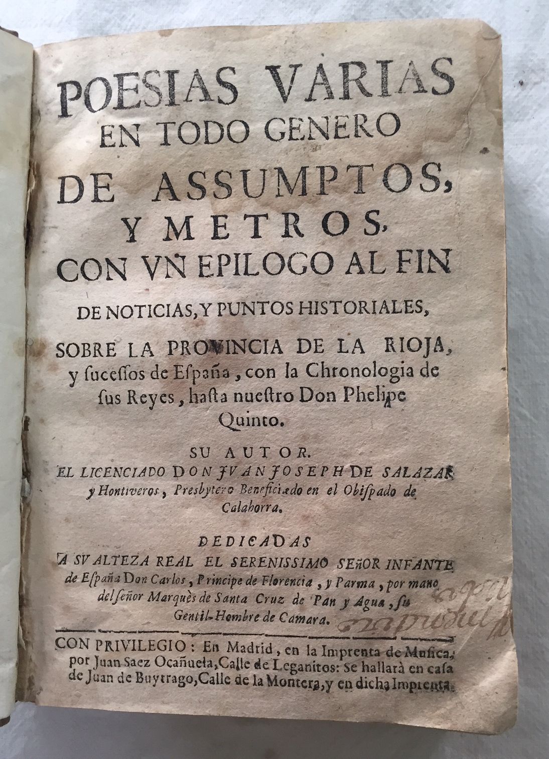 POESIAS VARIAS en todo género de assumptos y metros, con un epílogo al fin de noticias y puntos historiales, sobre la provincia de LA RIOJA y sucessos de España, con la chronología de sus reyes hasta nuestro D. Phelipe V.
