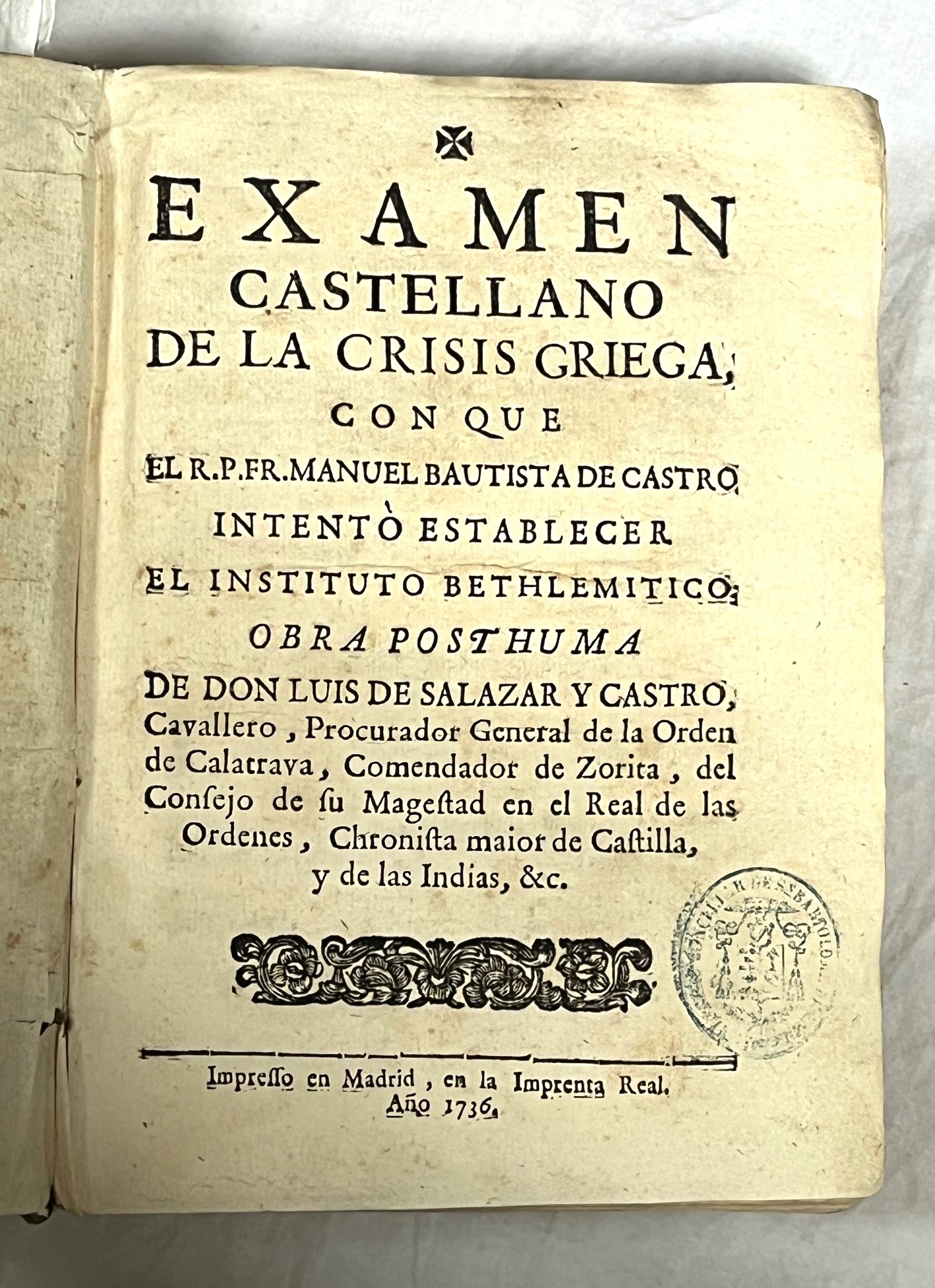EXAMEN CASTELLANO DE LA CRISIS GRIEGA, con que el R.P. Fr. Manuel Bautista de Castro intentó establecer el Instituto Bethlemitico. Obra Posthuma