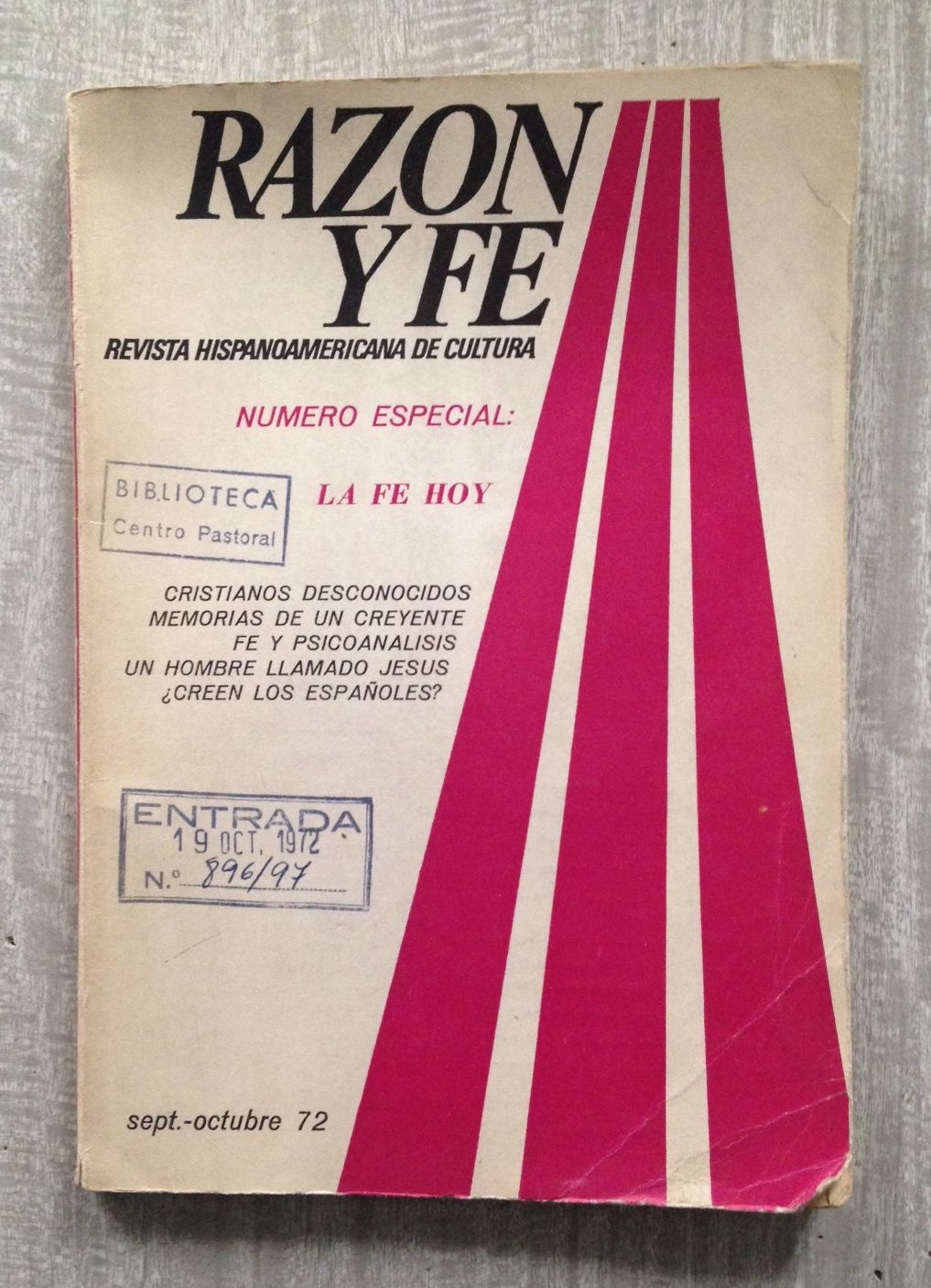 RAZON Y FE. Revista hispanoamericana de cultura. Número especial. Sept.-octubre 72. La Fe hoy. Cristianos desconocidos. Memorias de un creyente. Fe y psicoanálisis. Un hombre llamado Jesús. ¿Créen los españoles?.